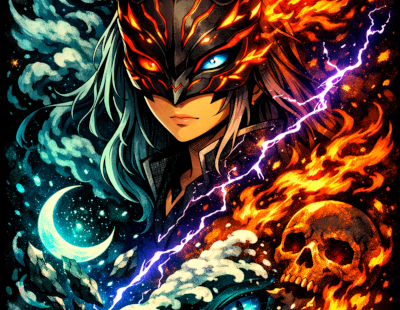 Masked Abstract Anime Water With Fire Hybrid Design With Lightning
